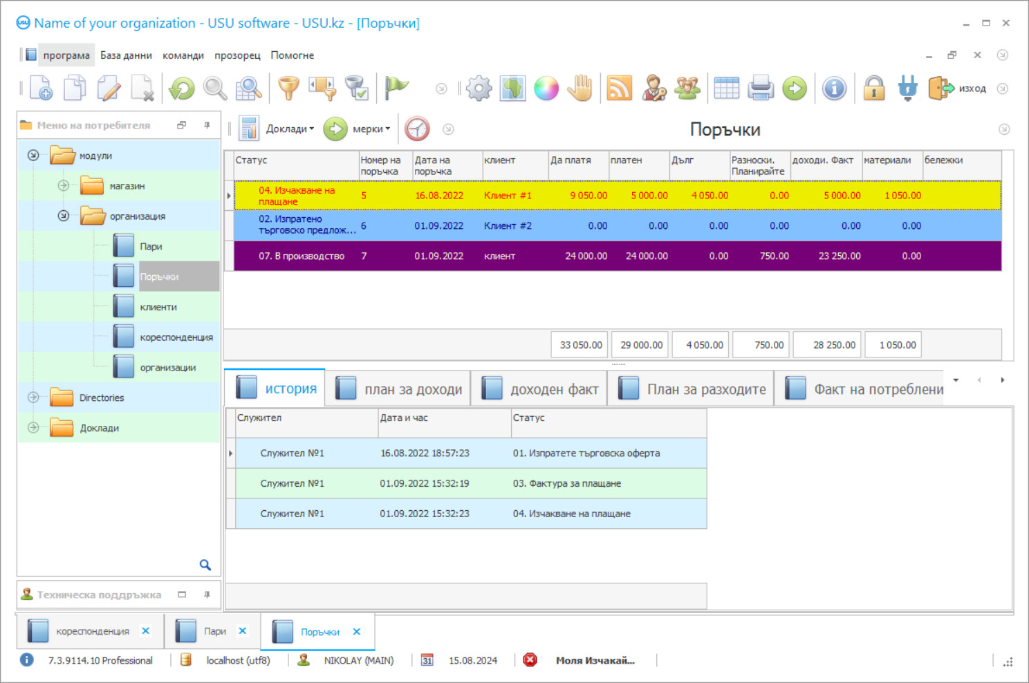 Управлението на клиентските поръчки допуска по-подробно и ефективно наблюдение на всяка поръчка и процеса на взаимодействие с всеки клиент, в зависимост от спецификата на поръчките и предпочитанията на клиентите. Създаване и поддръжка на база данни с неограничени възможности за съхранение и обработка на данни. Складирането се осигурява чрез счетоводно управление на поръчки, управление на клиенти, инвентаризация, баркодиране, аналитична оценка на ефективността на склада. Използване на опции за планиране и прогнозиране, прилагане на бюджетиране. Всички опции са насочени и фокусирани върху компетентното и обмислено развитие на дейностите на компанията, като се вземат предвид рисковете, възможното ниво на печалба и др. Има опция за напомняне, която ще ви позволи да завършите работните задачи навреме, да планирате работен ден и не пропускайте важни събития. Пощата в различни формати ще ви позволи да поддържате тесен контакт с клиента.