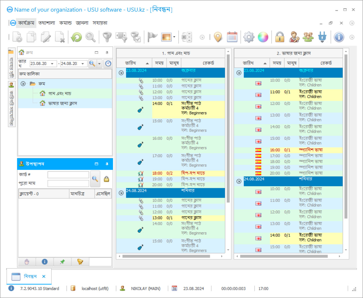 তফসিলটিতে একটি সুবিধাজনক বিন্যাস রয়েছে এবং একক শ্রেণিকক্ষের প্রসঙ্গে প্রশিক্ষণ কার্যক্রমের বিশদ দেয় - একটি বড় উইন্ডোতে কয়টি কক্ষ এবং অন্যান্য তথ্য সংগ্রহ করা হবে। শ্রেণিকক্ষের জানালার অভ্যন্তরে পরিকল্পনা করা পাঠগুলির শুরুর সময় রয়েছে, তাদের প্রত্যেকের পাশে একজন শিক্ষক, একটি দল, পাঠের নাম এবং ক্লায়েন্টের সংখ্যা পড়ানো হবে। পাঠের পরে, শিক্ষক তার বা তার বৈদ্যুতিন উপস্থিতি জার্নালটি খুলুন এবং উপস্থিত বা অনুপস্থিত যারা গ্রাহকদের নোট করেছিলেন। এই তথ্যটি তফসিলটিতে প্রদর্শিত হবে যা প্রদত্ত পাঠের বিপরীতে সমাপ্তির একটি বিশেষ পতাকা প্রতীক এবং এটি পরিদর্শন করা শিক্ষার্থীদের পরিমাণের একটি ইঙ্গিত সহ প্রদর্শিত হবে। তথ্যটি বিভিন্ন দিক থেকে সরিয়ে নিয়ে যায়, কারণ বেশ কয়েকটি ক্রিয়াকলাপের জন্য এই তথ্যটি গুরুত্বপূর্ণ।