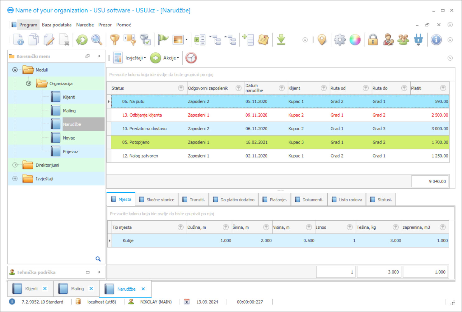 Obrazac prijave i nudi opcije raznih popusta i promocija vezanih za isporuku robe potrošaču. Uspostaviće se sistem ocjenjivanja za ocjenu kvaliteta rada zaposlenih u opisanoj oblasti. Plaćanje za isporuku usluga i računovodstvo ovog plaćanja su automatizovani. Računovodstvo isporuke vršit će se u svim fazama provedbe ovog procesa: od podnošenja zahtjeva do primanja robe od strane klijenta. Usluge dostave postaju neometane. Računovodstvo rada kurira je automatizirano. Računovodstvo rada dispečera je takođe automatizirano. Automatiziramo sljedeće vrste računovodstva usluga: dolaznih aplikacija, usluga povratnih informacija, usluga pakiranja, usluga istovara. Pomoću naše aplikacije možemo organizirati računovodstvo isporuke različitim prijevoznim sredstvima: kamionima, automobilima itd.