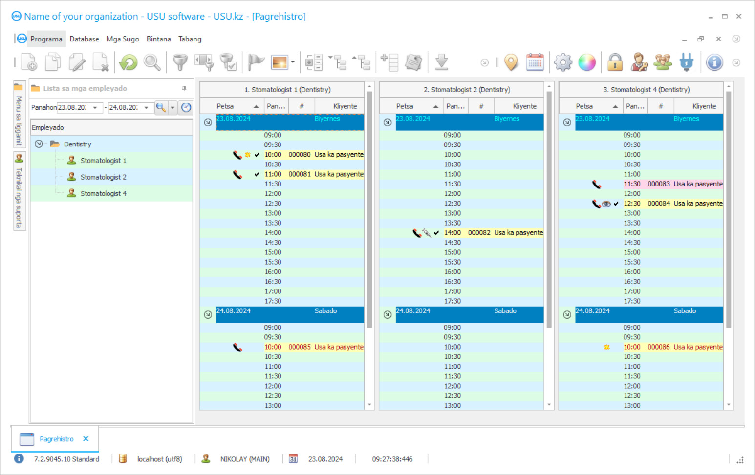 Ang pagpaila sa programa nga awtomatiko sa usa ka klinika sa ngipon mao ang labi ka hinungdanon nga butang sa bisan kinsa nga pangulo sa organisasyon! Ug propesyonal kami nga gitabangan sa niining buluhaton! Ang USU-Soft dental clinic, usa ka universal nga programa sa pagdumala, mahimong magamit aron mapatuman ang awtomatiko sa tanan nga aspeto sa mga kalihokan. Uban sa programa sa pagpugong sa klinika sa ngipon, ang matag dentista makahimo sa pagpugong sa pagtambal sa ilang mga pasyente, ilang pagtambong ug pagbayad. Ang pag-asoy sa klinika sa ngipon sa programa nga USU-Soft gihimo uban ang posibilidad nga pagtan-aw sa archival sa tanan nga mga litrato sa X-ray sa bisan kinsa nga kliyente. Ang among programa sa pagdumala sa klinika sa ngipon, nga adunay usa ka intuitive menu, sigurado nga mahimong usa ka tinuud nga katabang sa imong institusyon! Ang panan-aw sa mga bintana sa programa mahimong mapaigoigo sa matag tiggamit nga tagsatagsa nga naggamit nindot nga mga template sa laraw. Ang programa sa kompyuter sa klinika sa ngipon awtomatiko nga gitipig ang tanan nga mga setting sa gumagamit. Ang programa sa dental clinic mahimong ma-download sa among website nga libre! Ang kalainan ra mao nga sa bersyon sa demonstrasyon sa programa dili ka makasulod bag-ong datos sa mga direktoryo. Gipalambo namon ang ingon nga programa sa klinika sa ngipon, diin sigurado ka nga malipay ka nga matuman ang imong operasyon! Ig-awtomatiko ang imong trabaho sa programa sa USU-Soft dental clinic, ug sa ingon mahimo nimo nga i-awtomatiko ang tibuuk nga kapunungan!