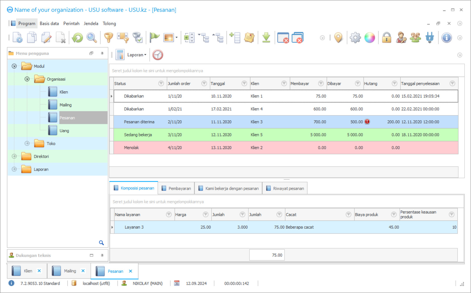Setiap kontrak dapat disahkan melalui pendaftaran. Jika pelanggan ingin bekerja secara langsung tanpa kontrak, tetapi dengan perkiraan, maka pembayaran dilakukan secara terpisah. Jika Anda mau, spesialis kami dapat membuat proses pembuatan kontrak secara otomatis dalam bentuk MS Word. Manajemen biaya terutama tersedia bagi manajer. Modul bekerja dengan pesanan menyoroti pesanan yang diperlukan menggunakan nomor identifikasi, tanggal penerimaan atau tanggal pengiriman yang diharapkan dan nama karyawan yang menerima pesanan. Bidang status dalam kategorisasi pesanan menunjukkan tahapan eksekusi. Panggung juga dikontrol dalam cerita, di mana waktu pelaksanaan ditampilkan dengan presisi hingga detik. Anda memfilter produk berdasarkan ID unik, cacat, persentase kontribusi produk, dan biaya. Jendela prabayar menyimpan pembayaran di muka dari setiap klien dan menampilkan utangnya. Pengiriman massal dilakukan dengan menggunakan SMS atau email, di mana Anda dapat memberi selamat atau memberi tahu tentang berita atau menginformasikan tentang kesiapan pesanan. Program USU-Soft cleaning dan budgeting membantu Anda mencapai hasil yang belum pernah terjadi sebelumnya dalam waktu sesingkat mungkin!