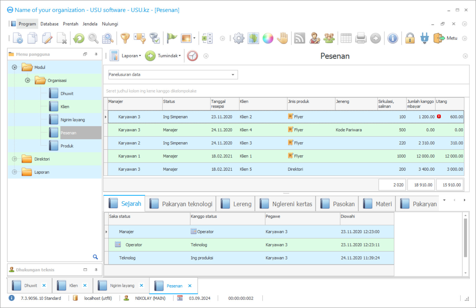 Kaya sing sampeyan ngerteni, ing institusi apa wae, sampeyan kudu nindakake sirkulasi dokumen. Apa wae formulir sing digunakake ing organisasi sampeyan, program bakal bisa ngisi kanthi otomatis, amarga template sing wis dirancang. Analisis pembayaran lan petungan uga menehi ngerti sampeyan pelanggan, sing isih kudu mbayar layanan sing diwenehake. Bentuk basis pelanggan elektronik sing unik adhedhasar data sing dilebokake ing cathetan, sing banjur ditrapake kanggo ngirim kabar akeh. Manajemen mesthi bisa ndeleng informasi babagan pesenan sing isih ditundha lan lagi ditindakake ing lantai toko.