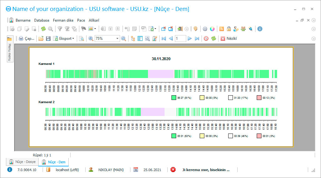 Qertek raporê ya ku bi hûrgulî demên ku karmend bi rastî dixebitî, dema ku ew derket, dema ku mişk neçû û klavye nehat bikar anîn, dema ku rûpelên qedexekirî hatin vekirin, û hwd. Rêbazek sererastkirinê ya mezin e. Pêvajoyên rêveberiyê di sala 2021 de dê bi pergala Nermalava USU re pir hêsan bibe. Hûn dikarin nirxandinên bikarhênerên me di tabek cuda de li ser malpera fermî bibînin.