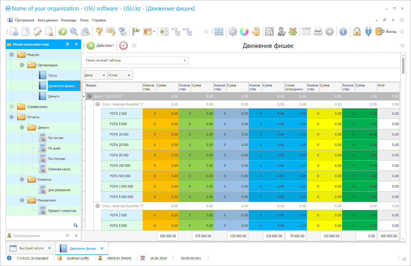 Įrankiai, kuriuos turėsite savo žinioje, padės pakelti jūsų verslą į naują lygį, svečiams patiks požiūris ir paslaugų kokybė, registracijos ir finansinių operacijų greitis. Toks požiūris neabejotinai padidins klientų pasitikėjimą ir lojalumą, o tai savo ruožtu turės įtakos lankytojų bazės plėtrai ir atitinkamai pelnui. Taigi, kiekvienas lošimo centruose reikalingas stalas bus laikomas griežtai laikantis reikalavimų ir pritaikytų algoritmų. Darbuotojams tereikia suvesti duomenis į atitinkamas eilutes, stulpelius, sistema neleis išsaugoti dokumento neužpildžius kiekvieno punkto. Lentelės formą pagal eilučių ir stulpelių skaičių galima nesunkiai koreguoti, tačiau, pridedant skaičiavimų formules, su tuo susidoros net pradedantysis. Be to, platforma stebės kiekvieno vartotojo darbą, atspindėdama jo veiksmus specialioje vadovams skirtoje ataskaitoje. Elektroninis planuotojas leis nepamiršti svarbių reikalų, įvykių ir skambučių, operatyviai apie juos primindamas darbuotojams. Tačiau tik aukščiausioji vadovybė galės gauti prieigą prie visos oficialios informacijos ir naudotis visomis funkcijomis, likusiems bus taikomi apribojimai, priklausantys nuo jų darbo pareigų. Taip atskirai nustatomi lošimo salių kasininkų, pagrindinės kasos, administratorės ir registratūros nustatymai. Tai padės nesiblaškyti nuo kitų priemonių ir tuo pačiu apsaugos konfidencialią informaciją nuo pašalinės įtakos, esant poreikiui, galėsite išplėsti prieigos teises. Norėdami įvertinti verslo rezultatus sukonfigūruotu dažnumu, sistema sugeneruos ataskaitų paketą bet kokiems parametrams ir rodikliams.