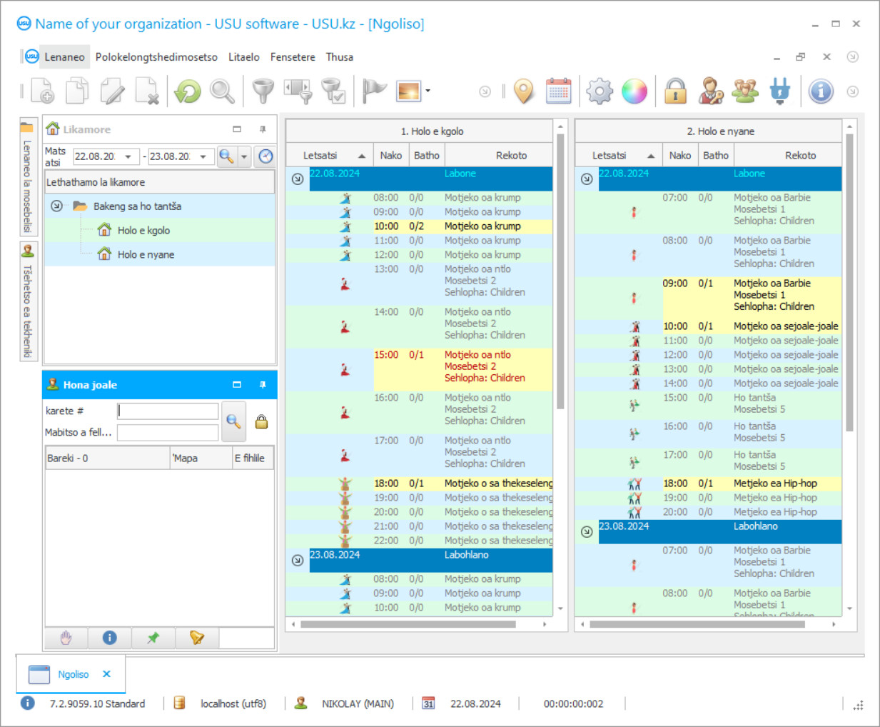Lenaneo le theha kamano e atlehang le bareki, e ikemiselitsoeng ke melaoana ea CRM e batloang haholo. Ha ho thata ho basebelisi ho laola mesebetsi ea papatso le papatso ea sebopeho. Basebelisi ba 'maloa ba ka tsamaisa tlelabo ea motjeko ka nako e le ngoe. Ha ho sehlopha se le seng sa motjeko, sekolo kapa setsi se hanang monyetla oa ho ikopanya le baeti ka potlako ka module ea mangolo-tsoibila ea SMS. Tsebisa bareki, romella melaetsa ea papatso. Mekhatlo ea setso, matlo kapa litsi ha lia tlameha ho sebetsa nako e telele tafoleng ea basebetsi. Boikemisetso bo iketsetsa mananeo a thupelo ho ipapisitse le litekanyetso tse fapaneng. Ha ho motho ea hanelang ho fetola maemo a feme ho fumana taolo e felletseng ea ts'ebetso ea letsatsi le letsatsi. Haeba ho hlokahala, lenaneo le nka eseng feela litšebeletso empa hape le nka thekiso ea assortment. Sehlooho ka seng se ka thathamisoa hantle. Haeba lits'oants'o tsa setsi sa setso, studio kapa ntlo li le hole le maemo, ho bile le phallo ea setsi sa bareki, mokhoa o mobe oa phaello oa rekotoa, bohlale ba software bo tla lemosa ka sena. Ha ho ketsahalo ea motjeko e sa tsejoeng, ebile le ts'ebetso ea basebetsi ha e eo. Sehlopha sefe kapa sefe sa tantši ea boqapi se khona ho laola ka botlalo boemo ba letlole la thepa - lisebelisoa tsa mmino, lethathamo la liaparo, liaparo. Ha hoa qheleloa ka thoko hore tšehetso ea dijithale e ka fanoa bakeng sa odara, e tla lumella ho tsebisa boqapi bo bong ba mahlale a morao-rao, ho kenya li-extensions tse sebetsang tse sa kenyellelitsoeng ho spectrum ea mantlha.