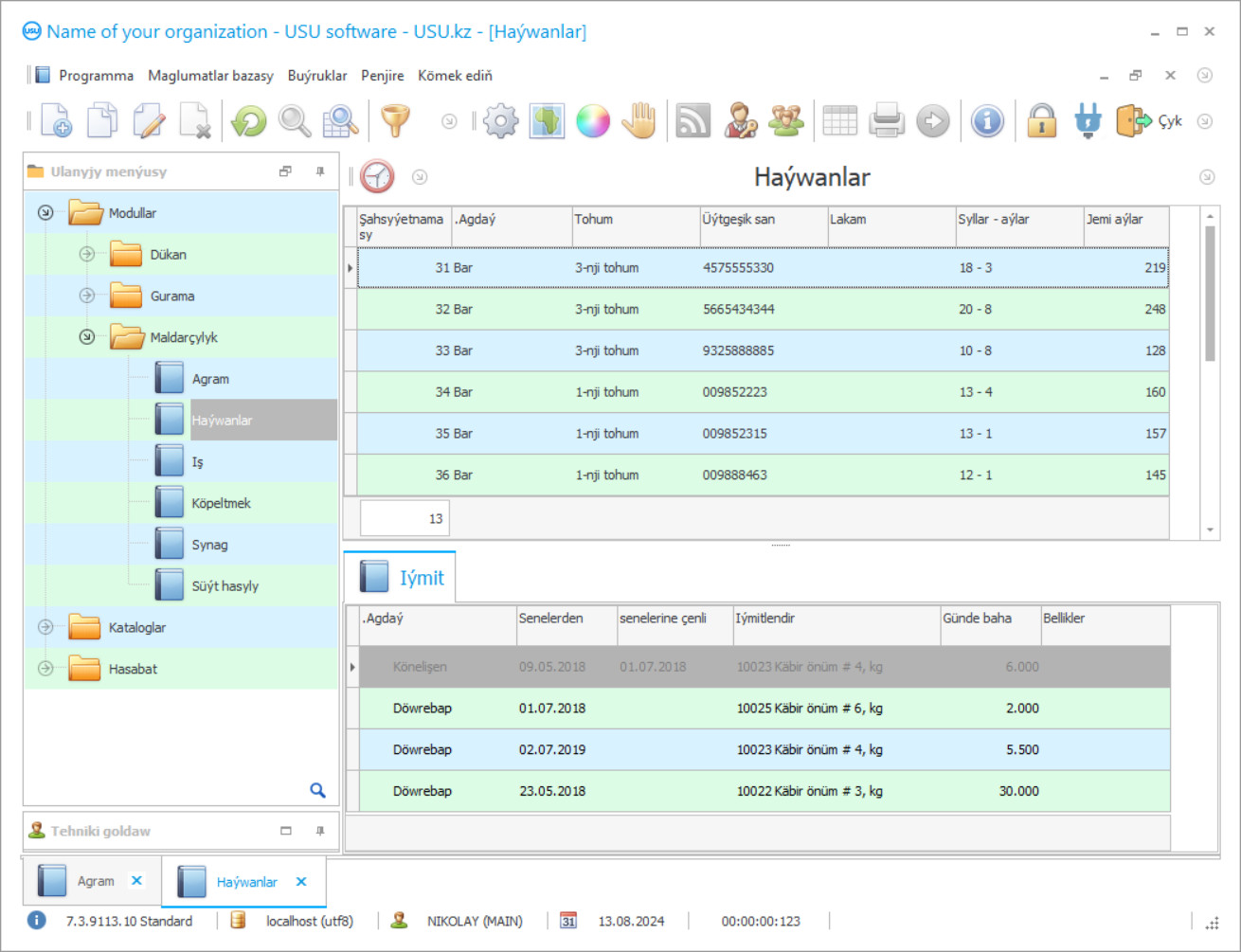 "Hasabatlar" modulynda esasy analitiki buhgalteriýa düzmek mümkin, onuň kömegi bilen ýakyn geljekdäki ösüşdäki çaklamalary yzarlamak mümkin. Awtomatlaşdyrylan programmada, akylly gözleg ulgamynyň kömegi bilen birnäçe ýazgyny birnäçe kriteriýa boýunça tapyp bilersiňiz. Programmanyň çäginde bilelikdäki işleri amala aşyrmak üçin daýhanlar ýekeje ýerli tora ýa-da internete birikdirilmelidir. USU programma üpjünçiligi, fermadaky haýwanlaryň gatnaşygy we iýmitleniş tertibine gözegçilik etmek ýaly köp funksiýa düzülip bilner. Simpleönekeý programma uzakdan gurnalýar we işiňize çalt başlamaga mümkinçilik berýän iş stolundaky gysga ýoldan işleýär. Müşderi bazasy bilen gowulaşan arabaglanyşyk USU Programma üpjünçiliginiň internet bilen sinhronlanmagy bilen üpjün edilýär. Islendik resminama, programmistlerimiz bilen öňünden ara alnyp maslahatlaşylýan kompaniýanyň nyşany we jikme-jiklikleri bilen düzülip bilner. Beýleki ferma hasapçylyk programmalary bilen aňsatlyk bilen aragatnaşyk saklaýar, şonuň üçin dürli elektron faýllary geçirmek kyn däl. Kompaniýamyzyň her bir potensial müşderisi üçin, saýtdan aňsatlyk bilen göçürip alyp bolýan ulgam gurnamagynyň mugt demo wersiýasy bar. Daýhanlar üçin şahsy hasaplaryň barlygy sebäpli, olaryň işini yzarlamak we şu görkezijiler esasynda aýlyk haklaryny hasaplamak has aňsat bolar.