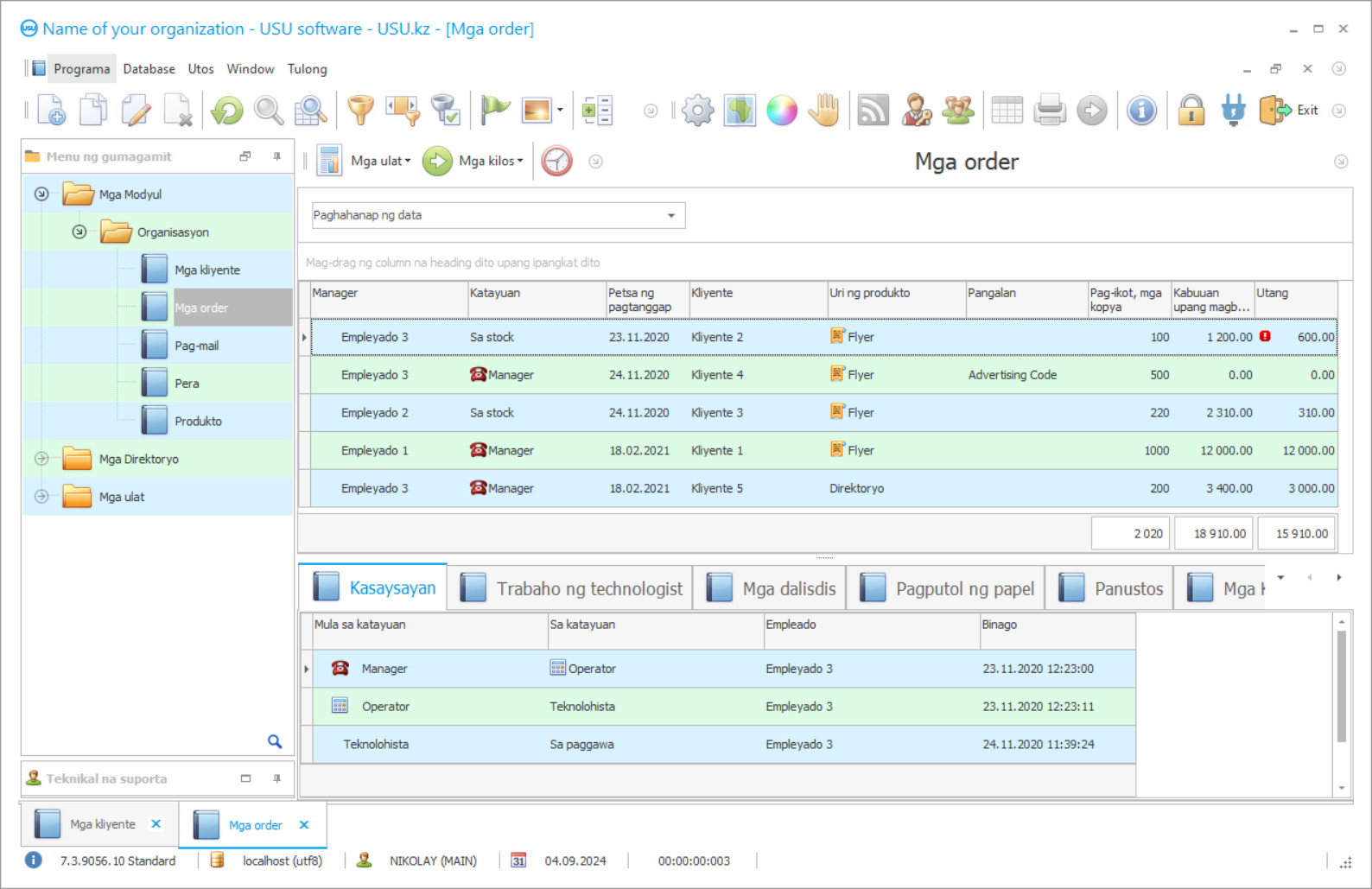 Tulad ng alam mo, sa anumang institusyon kinakailangan upang isagawa ang sirkulasyon ng dokumento. Anumang mga form ang ginagamit sa iyong samahan, awtomatikong mapupunan ng programa ang mga ito, salamat sa mga paunang naka-disenyo na template. Ang pagtatasa ng mga pagbabayad at kalkulasyon ay nagpapaalam din sa iyo kung alin sa mga customer, kailangan mo pa ring magbayad para sa mga naibigay na serbisyo. Bumuo ng isang natatanging base ng kostumer ng elektronikong batay sa data na ipinasok sa mga talaan, na pagkatapos ay inilapat sa pangmaramihang pagpapadala ng mga abiso. Palaging nakikita ng pamamahala ang impormasyon tungkol sa kung aling mga order ang nakabinbin pa at isinasagawa sa sahig ng shop.